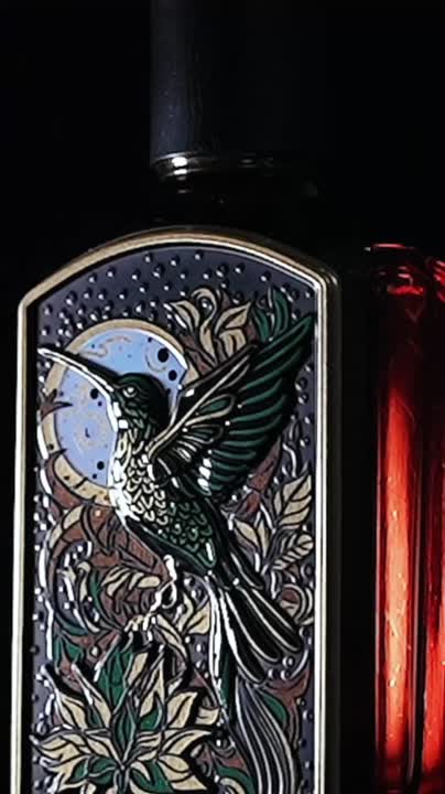The design concept combines a girl scenting flowers for a visually stunning emblem for a perfume bottle, this Metlux coating depicts color-shifting effects, floral accents, gradient effects for depth, reflective details for elegance, subtle texture for tactile interest, and strategic placement on the bottle, capturing the magical essence of the design.