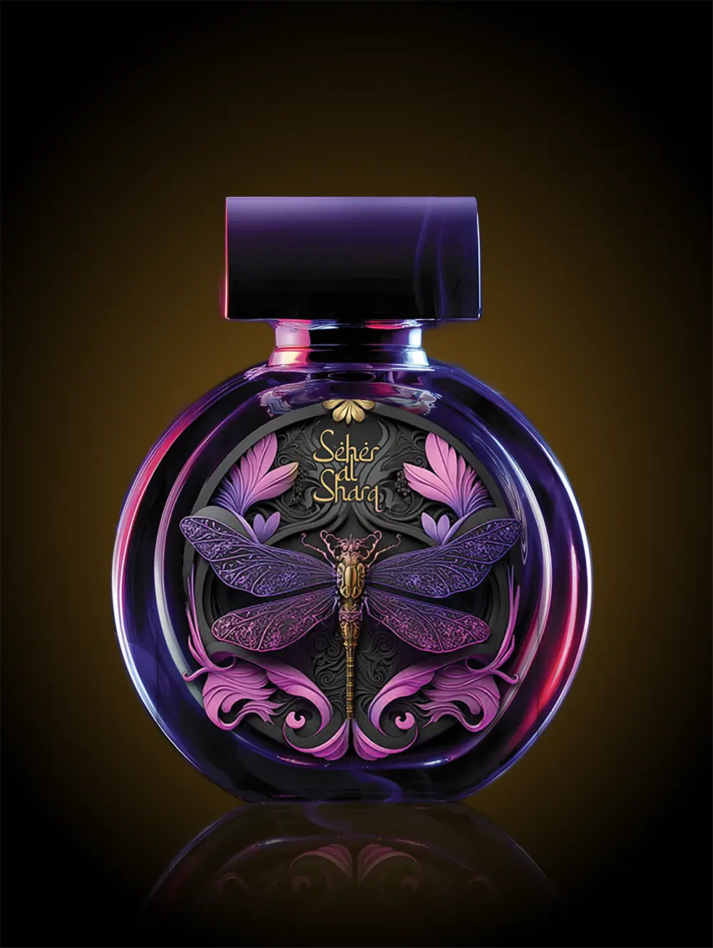 Metlux technology is used to create stunning visual effects on a dragonfly-inspired perfume bottle. The design concept includes an iridescent coating that mimics the colors of dragonfly wings, veined wing patterns, a smooth gradient transition, reflective metallic accents, textured effects, and leveraging light play. By integrating this, the perfume bottle becomes a captivating work of art that combines the beauty of nature and technology.